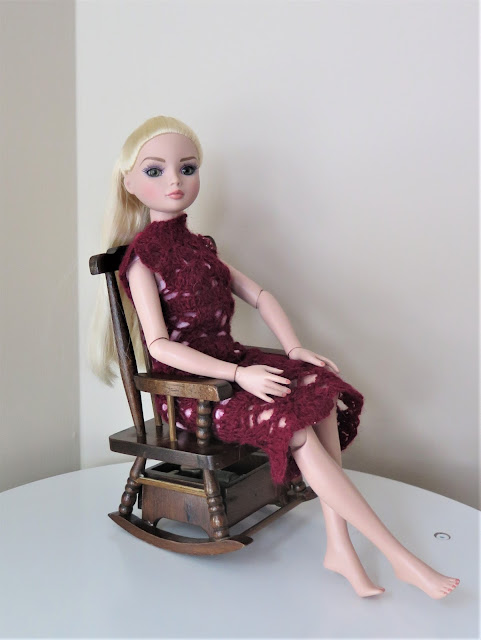 As with other doll projects, I used leftover acrylic mohair-like yarn to crochet this dramatic dress. The design is my own improvised pattern.